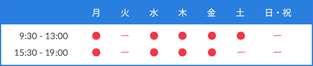 受付(営業)時間 月〜金 9:30〜13:00 / 15:30〜19:00