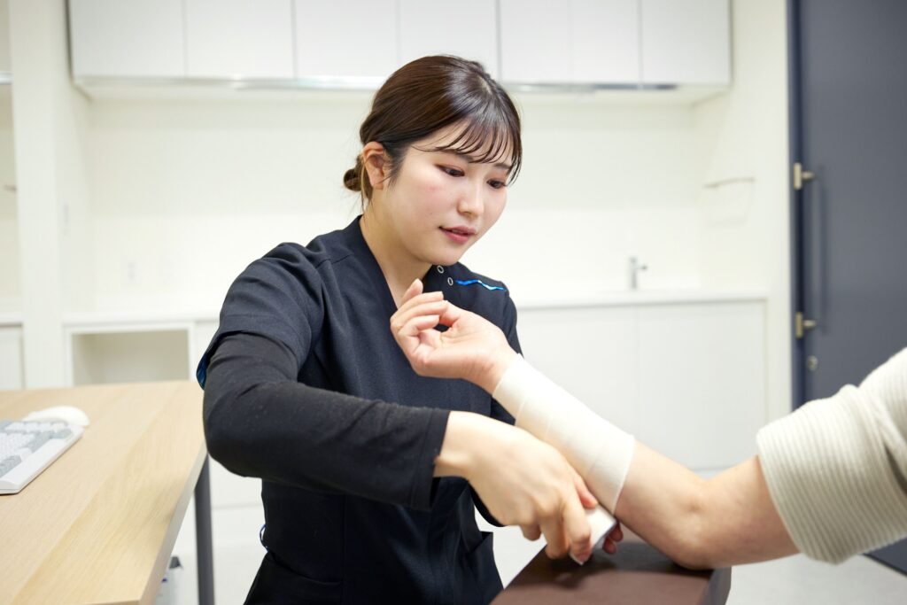 安静指導、固定、薬物療法、注射などの保存療法を行います。受傷直後の急性期には、RICE処置(安静・冷却・圧迫・挙上)についての指導も行います。